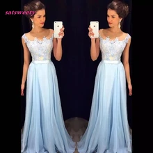 Latest price Bridesmaid Dresses Elegant Light Sky Blue Sheer Neck Cap Sleeves Appliqued Chiffon Floor Length Modest Prom Dresses Wedding Party Dress